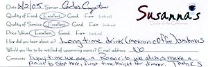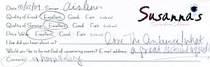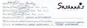 These Comment Cards were written by our Customers after dining at our restaurant. We wanted to thank them for their opinions, and to share them with you. Please click on the cards for a larger view.