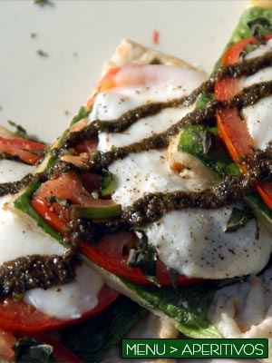 Pan plano bañado con Aceite de Olivo y Ajo, Tomate Roma, Espinaca, Mozzarella fresco y Albahaca, cubierto con Pesto