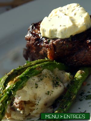 Grilled Sonora Filet Mignon, topped with Herb Butter and served with Garlic Mashed Potatoes and grilled Asparagus